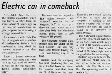 In June, Robert L. Balfour (VP at Club Car, Inc., Augusta, Georgia) signed a $1.8 million contract to go into mass production manufacturing electric vehicles for Vanguard Vehicles, Inc. (in Kingston, N.Y.). 50 prototype vehicles were already manufactured in the past three years, and they had a six month backlog of orders, resulting in building a new plant in Sebring Florida.
