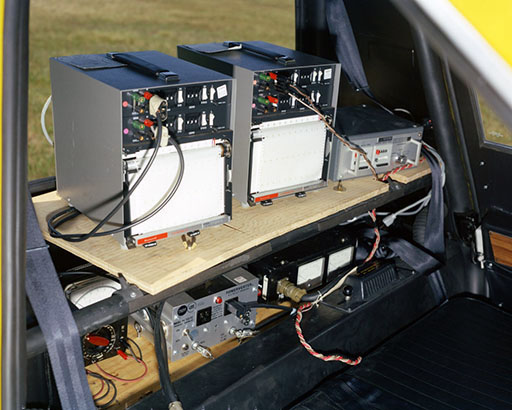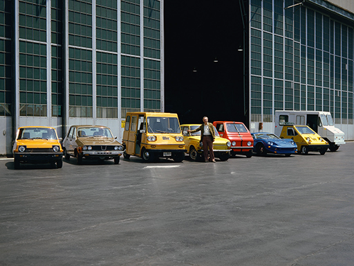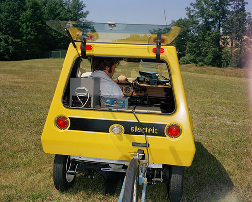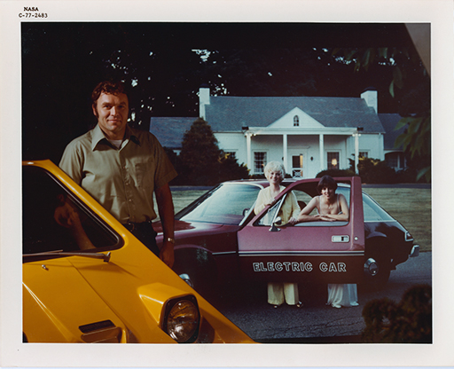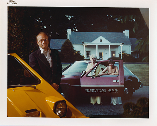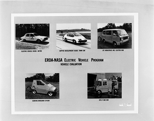 The National Aeronautics and Space Administration (NASA) Lewis Research Center tested 16 commercially-manufactured electric vehicles, including these, during the mid-1970s. Lewis and the Energy Research and Development Administration (ERDA) engaged in several energy-related programs in the mid-1970s, including the Electric Vehicle Project. NASA and ERDA undertook the program in 1976 to determine the state of the current electric vehicle technology. The tests were primarily conducted on a 7.5-mile track at the Transportation Research Center located approximately 160 miles southwest of Cleveland, Ohio. Some of the vehicles had analog data recording systems to measure the battery during operation and sensors to determine speed and distance. The tests analyzed the vehicle’s range, acceleration, coast-down, braking, and energy consumption. From left to right: RIPP-Electric, EVA Contactor, Otis P-500, C.H. Waterman DAF, Zagato Elcar, unknown, Sebring-Vanguard Citicar, and Hattronic Minivan