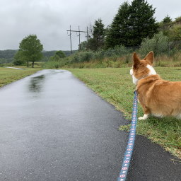 Teddy and I took a walk along the Royal Shenandoah Greenway. Its a little path that goes around the whole town. It runs along Happy Creek, down to the Bing Crosby stadium. It also goes through a few parks and along various roads. We took our time casually strolling along the trail. I let Teddy sniff around at his own pace. He would often lead me down toward the creek.